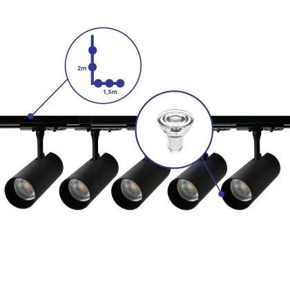 | Fabrikantnaam | Complete L shaped 1-Phase Track Set Black incl. 5x Spot fixture + GU10 2700K 3W Dim – 1,5 x 2 meter | |