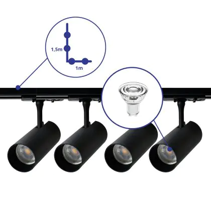 Bright Choice Complete Set 1-Fase Rail L 1 x 1,5 Meter Zwart | incl. 4x Spot + GU10 2700K 3W Dimbaar + Eindkap, Voedingsconnector en L -Verbindingsstuk