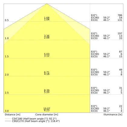![]() De kleurcode is een combinatie van de kleurweergave (CRI) en lichtkleur (Kelvin). Het eerste getal is de kleurweergave (1 = zeer slechte kleurweergave, 9 = maximale kleurechtheid). Het tweede en derde cijfer betreft de lichtkleur. Een lamp met kleurcode 830 heeft bijvoorbeeld een goede kleurweergave en straalt een warm wit licht uit (3000K), waar een lamp met de kleurcode 940 een uitstekende CRI heeft en een koel wit licht (4000K) uitstraalt. |