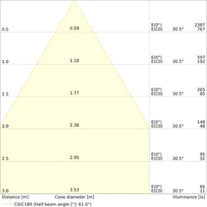 De gradenbundel geeft informatie over hoe breed het licht wordt uitgestraald. Dit zit tussen de 0 en 360 graden (D). Hoe kleiner de hoek, hoe specifieker de lichtbundel is. Over het algemeen is een smalle gradenbundel perfect voor sfeer- of accentverlichting, terwijl een brede gradenbundel ideaal is om grote oppervlaktes te verlichten.