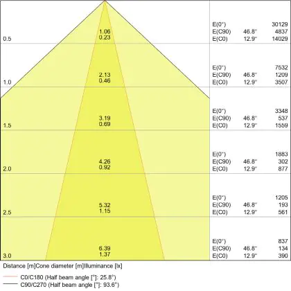 De gradenbundel geeft informatie over hoe breed het licht wordt uitgestraald. Dit zit tussen de 0 en 360 graden (D). Hoe kleiner de hoek, hoe specifieker de lichtbundel is. Over het algemeen is een smalle gradenbundel perfect voor sfeer- of accentverlichting, terwijl een brede gradenbundel ideaal is om grote oppervlaktes te verlichten.